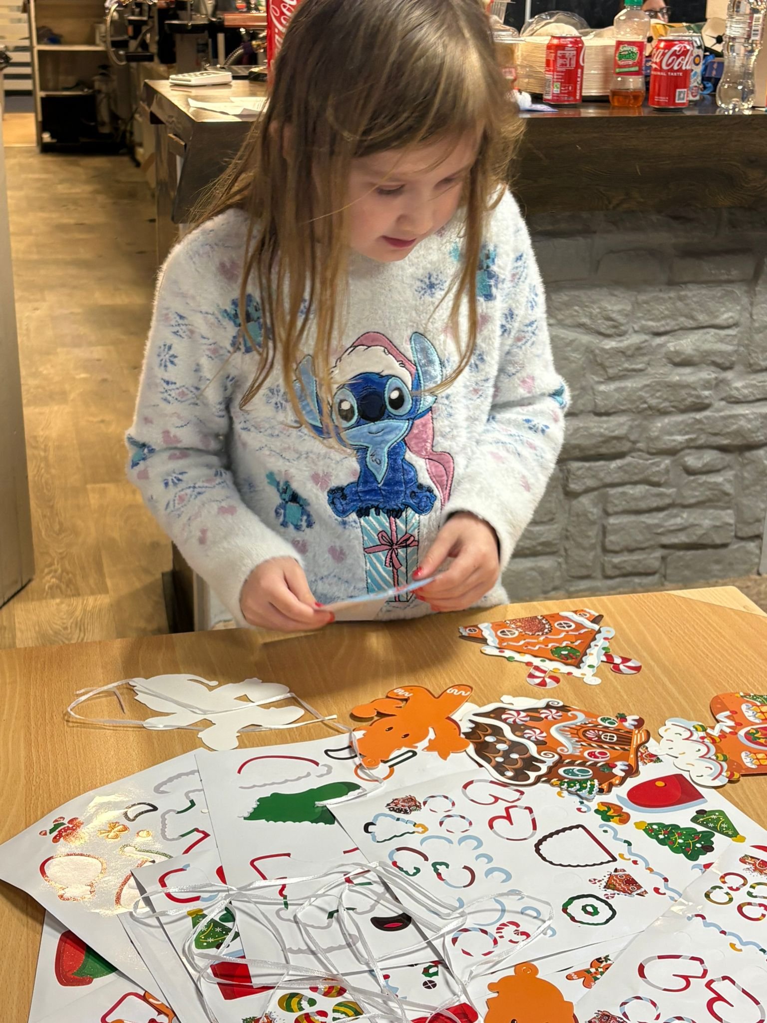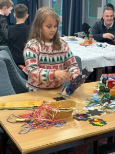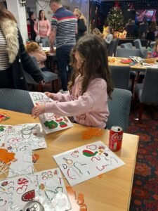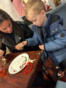 The decoration-making tables stayed busy from start to finish. Children carefully designed baubles, festive cards, and colourful decorations to take home or hang proudly on the tree.
